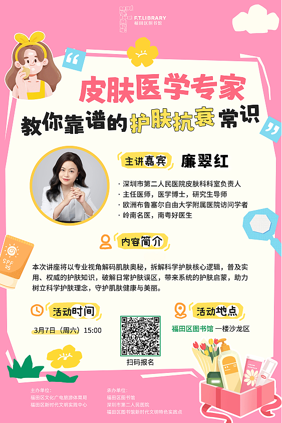 本次讲座将以专业视角解码肌肤奥秘,拆解科学护肤核心逻辑,普及实用、权威的护肤知识,破解日常护肤误区,带来系统的护肤启蒙,助力树立科学护肤理念,守护肌肤健康与美丽。